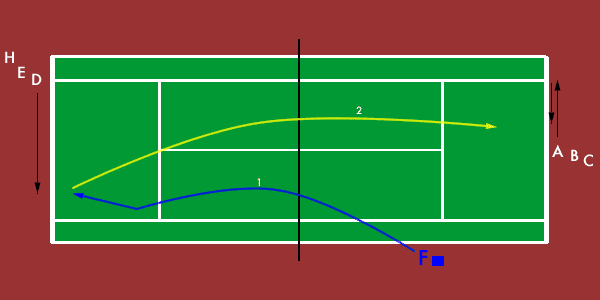 At the same time, their opponent (A) will have to sprint to the corner of the right singles side line/baseline and touch it with the foot before they can play the point.