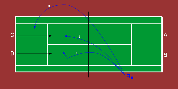 3. The last feed is a lob for team C-D (still at the net). The point is played out.